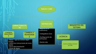 Este documento proporciona una introducción al sistema de monitoreo Nagios Core. Explica que Nagios Core es un sistema de código abierto para monitorear servicios de red y recursos de hosts. Sus características incluyen supervisión de servicios como SMTP, HTTP y ping, así como recursos como la carga de CPU y uso de disco. También describe cómo configurar el monitoreo de máquinas Windows, routers, switches y servicios públicamente disponibles usando Nagios.