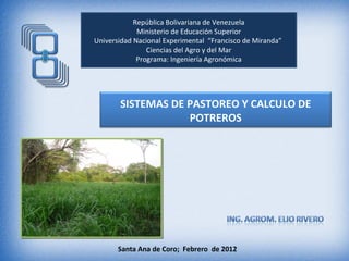 Este documento describe los sistemas de pastoreo y el cálculo de potreros. Explica los tipos de pastoreo como continuo, alternado y rotacional. También describe las leyes del reposo, ocupación, rendimiento máximo y rendimiento regular relacionadas con el pastoreo. Además, proporciona un ejercicio práctico sobre el cálculo del número de potreros y su tamaño requerido para manejar dos grupos de animales.