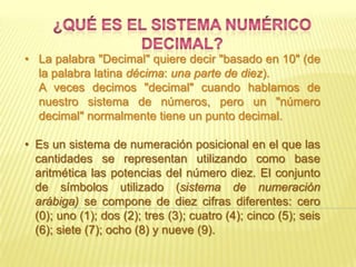 El documento describe el sistema decimal y cómo funciona. Explica que se basa en el uso de 10 símbolos (0-9) y que el valor de cada símbolo depende de su posición. También describe cómo se pueden representar números mayores de 9 usando las columnas de unidades, decenas, centenas y así sucesivamente.