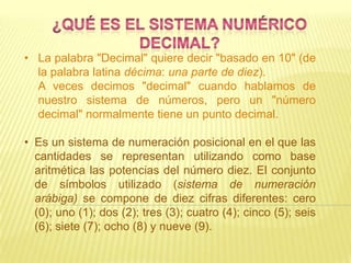 Este documento describe el sistema decimal y los números decimales. Explica que el sistema decimal está basado en el número 10 y utiliza 10 símbolos (0-9). También describe cómo la posición de cada dígito determina su valor, con cada posición aumentando el valor por un factor de 10. Finalmente, proporciona ejemplos para ilustrar cómo leer y escribir números decimales basados en su valor posicional.