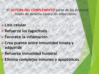 El documento resume el sistema del complemento, incluyendo su función, componentes, vías de activación, y regulación. Forma parte de la primera línea de defensa contra infecciones a través de lisis celular, fagocitosis, inflamación, y puente entre inmunidad innata y adquirida. Está constituido por proteínas solubles, receptores de membrana, y moléculas reguladoras.