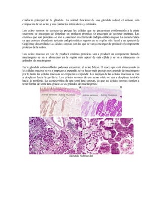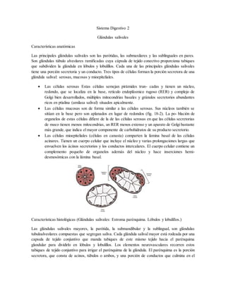 1) El documento describe las características anatómicas y histológicas de las glándulas salivales, el páncreas y el hígado. 2) Incluye detalles sobre las células y estructuras que componen estas glándulas, como los acinos, conductos e islotes de Langerhans. 3) También explica la importancia de estas glándulas en la digestión y la producción de enzimas y hormonas.