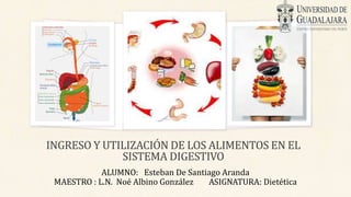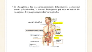 El documento resume las funciones y procesos del sistema digestivo humano. El sistema digestivo está compuesto por la boca, faringe, esófago, estómago, hígado, páncreas, vesícula biliar e intestino delgado y grueso. Cada órgano desempeña un papel importante en la ingestión, digestión, absorción y eliminación de los alimentos. El documento explica en detalle los procesos de masticación, deglución, secreción gástrica e intestinal, y la digestión y absorción de proteín