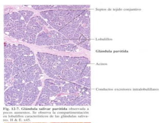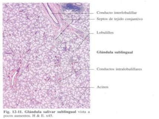 El documento proporciona una descripción detallada de la anatomía y estructura del sistema digestivo humano, incluidas las secciones de la cavidad bucal, esófago, estómago, intestino delgado e intestino grueso, así como las glándulas digestivas como el hígado y el páncreas. Se describen las características histológicas de cada parte, incluidos los tipos de epitelio, capas de tejido y glándulas presentes. También se incluye información sobre las diferencias en el sistema digestivo de