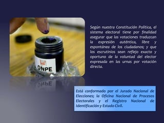 El sistema electoral peruano está conformado por el Jurado Nacional de Elecciones, la Oficina Nacional de Procesos Electorales y el Registro Nacional de Identificación y Estado Civil. Tiene como objetivo asegurar que las votaciones reflejen fielmente la voluntad de los ciudadanos y que los escrutinios sean un reflejo exacto de los votos. Cada entidad tiene funciones específicas como organizar los procesos electorales, mantener el registro de identidad de las personas y resolver controversias electorales.
