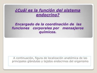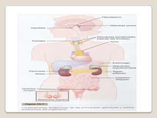 El documento describe el sistema endocrino y sus principales glándulas y hormonas. El sistema endocrino se encarga de coordinar las funciones corporales a través de mensajeros químicos llamados hormonas. Las principales glándulas endocrinas son el hipotálamo, la hipófisis, la tiroides, la corteza suprarrenal, el páncreas, los riñones y los órganos reproductores. Cada glándula secreta hormonas específicas que regulan funciones metabólicas, de crecimiento y desarrollo