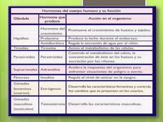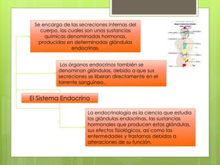 El sistema endocrino se encarga de las secreciones internas del cuerpo llamadas hormonas, las cuales son producidas por glándulas endocrinas y regulan procesos como el metabolismo, crecimiento y desarrollo. Las hormonas coordinan los procesos metabólicos del organismo y regulan funciones de los tejidos. La endocrinología estudia estas glándulas endocrinas, las hormonas que producen y sus efectos fisiológicos.