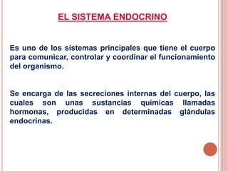 El sistema endocrino controla y coordina el funcionamiento del organismo a través de las hormonas producidas por las glándulas endocrinas. Ayuda a mantener procesos como los niveles de energía, la reproducción, el crecimiento y la homeostasis. Las principales glándulas endocrinas incluyen la hipófisis, la tiroides, las suprarrenales y los ovarios/testículos. Las hormonas se regulan a través de mecanismos de retroalimentación y control nervioso y cronotrópico. Las alteraciones en la producción hormonal pued