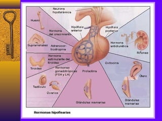El sistema endocrino regula funciones vitales a través de glándulas endocrinas y hormonas. Las principales glándulas son la hipófisis, tiroides, paratiroides, suprarrenales, páncreas e hipotálamo. Estas glándulas secretan hormonas como la insulina, tiroxina y cortisol para controlar el metabolismo, crecimiento y homeostasis. El hipotálamo coordina el sistema endocrino a través de hormonas liberadoras y reguladoras de las hormonas de otras glándulas.