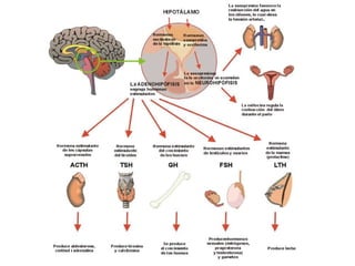 El documento proporciona información sobre el sistema endocrino. Explica que está formado por glándulas endocrinas que producen hormonas y las secretan a la sangre para regular funciones del organismo de forma coordinada. Describe las principales glándulas (hipófisis, tiroides, páncreas, suprarrenales, gónadas), las hormonas que producen y sus funciones. También aborda métodos de control hormonal y algunas enfermedades relacionadas como la diabetes y problemas de la glándula tiroides.