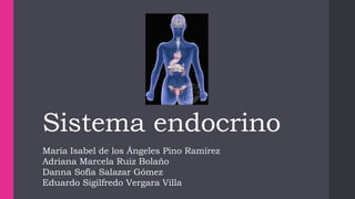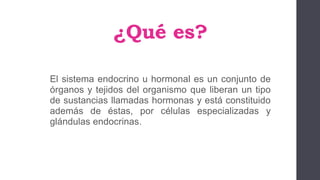 El documento describe el sistema endocrino y sus funciones. El sistema endocrino está compuesto de órganos y tejidos que segregan hormonas para controlar funciones químicas en las células, regular el metabolismo y desarrollo, y controlar la homeostasis. Las principales glándulas endocrinas incluyen la hipófisis, tiroides, páncreas, ovarios y testículos, cada una secretando hormonas específicas como la insulina, testosterona y estrógenos.