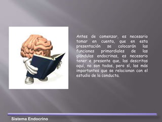 Este documento describe las principales glándulas endocrinas y sus hormonas. Explica que el sistema endocrino secreta hormonas que controlan funciones como el crecimiento, metabolismo, reproducción y desarrollo sexual. Detalla las hormonas y funciones de la glándula pituitaria, tiroides, paratiroides, páncreas, suprarrenales, testículos y ovarios.