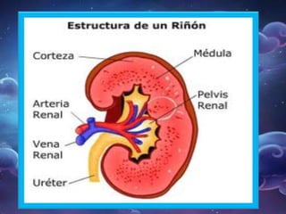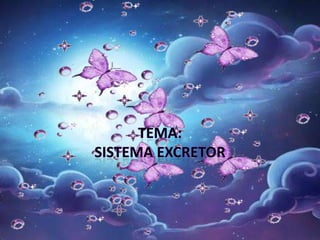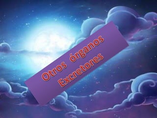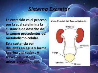 El documento describe los tres principales sistemas excretores del cuerpo humano: el sistema urinario, la piel y los pulmones. El sistema urinario expulsa la orina a través de los riñones, uréteres, vejiga urinaria y uretra. La piel elimina sustancias tóxicas a través del sudor de los poros. Los pulmones intercambian dióxido de carbono por oxígeno y eliminan el dióxido de carbono exhalado.
