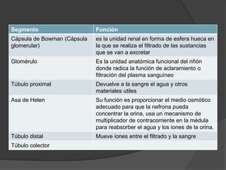 FunciónLa unidad funcionaldel riñón es la nefrona. Sus funciones básicas son: Filtración: algunas sustancias son transferidas desde la sangre hasta las nefronas. Secreción: cuando el líquido filtrado se mueve a través de la nefrona, gana materiales adicionales (desechos y sustancias en exceso). Reabsorción: algunas sustancias útiles son devueltas a la sangre para su reutilización.