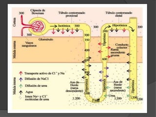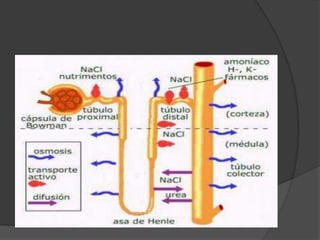 FunciónEl funcionamiento dela nefrona está basado en un intercambio de iones que comienza cuando el líquido sanguíneo ingresa a la cápsula de Bowman (que contiene los glomérulos) vía el tubo contorneado proximal. En esta cápsula y gracias a las mencionadas unidades glomerulares se realiza la filtración primaria donde el sodio, agua, aminoácidos y glucosa se reabsorben parcialmente debido a la composición semipermeable de las paredes y los microtúbulos de los glomérulos. Los iones de hidrógeno y potasio, así como el exceso de agua y otras sales (desperdicios), van a parar al conducto colector.