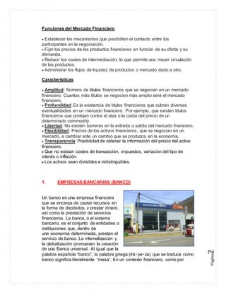 El documento describe el sistema financiero y los mercados financieros. Explica que el sistema financiero captura los ahorros y los canaliza hacia la inversión a través de intermediarios como los bancos y otras instituciones financieras no bancarias. También describe las principales funciones de los mercados financieros como facilitar el aumento de capital, la transferencia de riesgo y el comercio internacional. Luego detalla los tipos de operaciones bancarias como depósitos y préstamos, así como ejemplos de instituciones financieras no bancarias