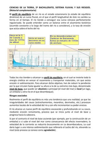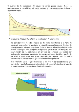 El documento describe el concepto de perfil de equilibrio de un río y los riesgos asociados. Un río tiende a alcanzar un perfil de equilibrio donde la erosión y sedimentación se equilibran, pero irregularidades en el cauce pueden causar erosión local. Si el nivel de base aumenta, por ejemplo debido a la construcción de un embalse, puede causar sedimentación aguas arriba que daña construcciones y ecosistemas. La construcción de embalses también puede causar erosión aguas abajo al liberar el río de sedimentos.