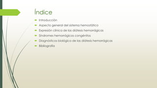 Este documento describe la aproximación clínica a la patología del sistema hemostático. Explica el funcionamiento general del sistema hemostático, incluyendo los compartimentos celular y plasmático. También describe la expresión clínica de las diátesis hemorrágicas a través de la historia clínica y la exploración física, así como los síndromes hemorrágicos congénitos como las coagulopatías y trombopatías.