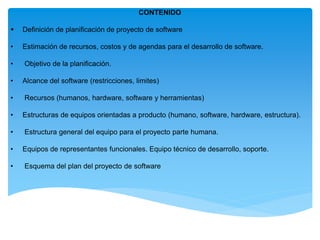 Este documento presenta una introducción a la planificación de proyectos de software. Define la planificación como fundamental para establecer las tareas, recursos y cronogramas requeridos. Explica que la estimación de costos, recursos humanos, hardware, software y herramientas es clave. También describe la estructura general de un equipo de proyecto de software, incluyendo roles como jefe de proyecto, líder de equipo, desarrolladores, diseñador gráfico y líder de calidad.