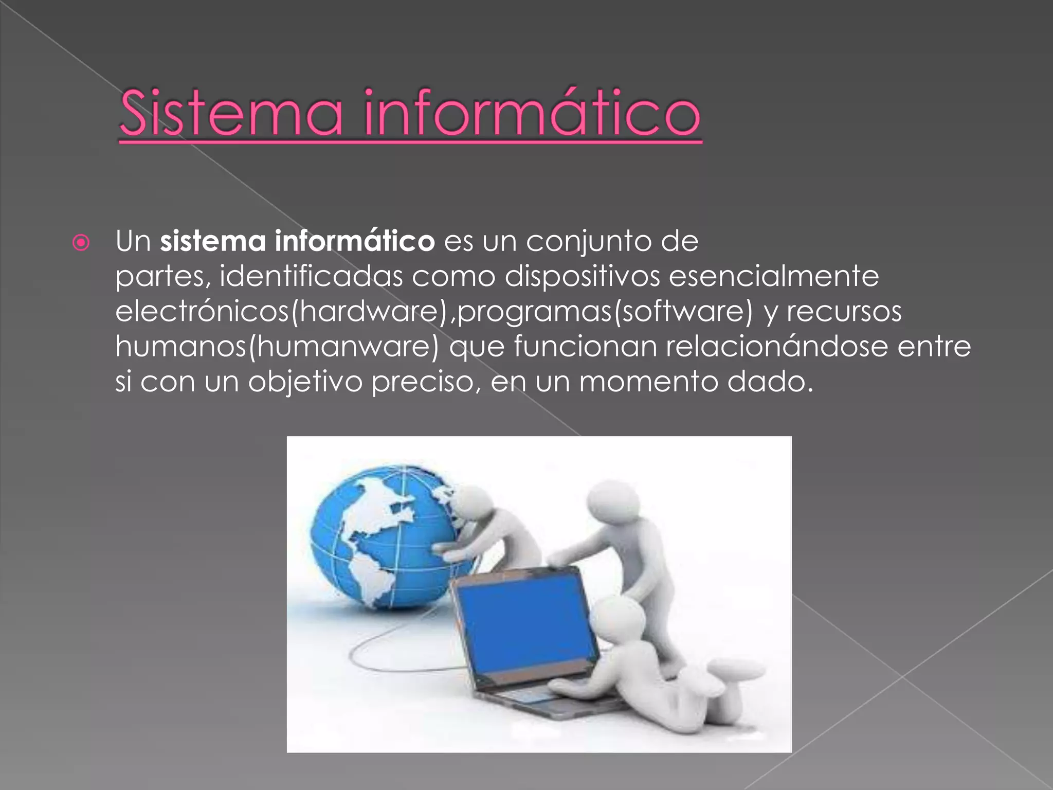 El documento describe los componentes principales de un sistema informático, incluyendo el hardware, software, y usuarios. Define hardware como los dispositivos físicos como la unidad central de procesamiento, memoria, y periféricos. El software incluye programas y aplicaciones. Los usuarios interactúan con la computadora. También describe las unidades de medida como bits, bytes, kilobytes y más.