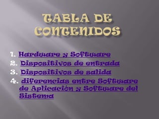 El documento presenta un resumen de un proyecto realizado por Carlos Ardila y Jonathan Leal del grado 9-4 sobre hardware y software. Explica conceptos como dispositivos de entrada y salida, y la diferencia entre software de aplicación y sistema. También incluye ejemplos de hardware como el teclado, ratón y monitor, y define software de aplicación y sistema.