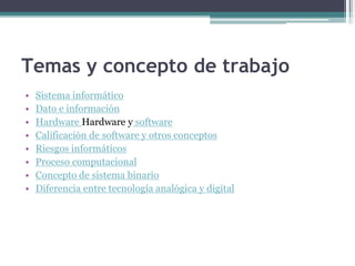 Un sistema informático consta de hardware, software, datos e información que interactúan para lograr un objetivo. El hardware son los componentes físicos como dispositivos de entrada y salida, mientras que el software son instrucciones que controlan la operación del sistema. Los datos se procesan y convierten en información significativa para los usuarios. Los sistemas digitales representan cantidades discretas utilizando los dígitos 0 y 1, a diferencia de los sistemas analógicos que varían de forma continua.