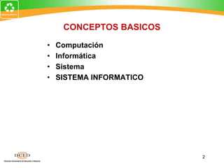 Este documento introduce conceptos básicos de informática. Explica que la informática es la ciencia que estudia el tratamiento automático y racional de la información mediante el uso del ordenador. Describe que el tratamiento de datos se divide en tres fases: entrada, proceso y salida. Define una computadora como un dispositivo electrónico que opera bajo el control de instrucciones almacenadas en su propia memoria y lleva a cabo operaciones de aritmética, lógica y almacenaje bajo software.