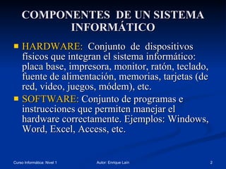 El documento describe los componentes básicos de un sistema informático, incluyendo el hardware como la CPU, memoria, discos duros y periféricos, y el software. Explica que la CPU procesa la información y coordina el flujo de datos, y que la memoria principal almacena temporalmente programas y datos.