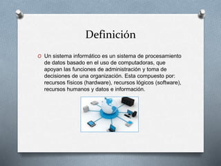 Un sistema informático es un sistema de procesamiento de datos basado en el uso de computadoras que apoyan las funciones de administración y toma de decisiones de una organización. Está compuesto por recursos físicos (hardware), recursos lógicos (software), recursos humanos y datos e información. Los datos se convierten en información útil una vez son procesados. Un sistema informático incluye software como sistemas operativos y aplicaciones, así como personal técnico y usuarios.