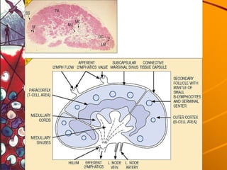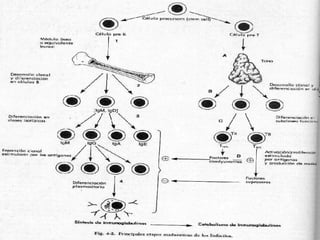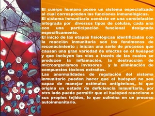 El documento describe el sistema inmunitario humano, incluyendo sus células, órganos y funciones. El sistema inmunitario está compuesto de órganos linfoides primarios como el timo y la médula ósea, que maduran las células inmunitarias, y órganos linfoides secundarios como los ganglios linfáticos, el bazo y los tejidos asociados a mucosas, que activan las respuestas inmunitarias a los antígenos.