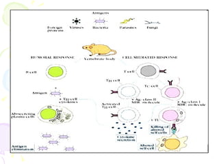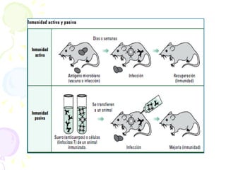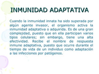 Este documento describe los conceptos clave de la inmunidad adaptativa o adquirida. Explica que involucra a los linfocitos B y T y su respuesta humoral y celular específica a antígenos. También describe la selección clonal, la producción de anticuerpos y células de memoria que garantizan protección a largo plazo contra patógenos previamente encontrados.