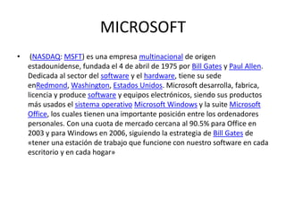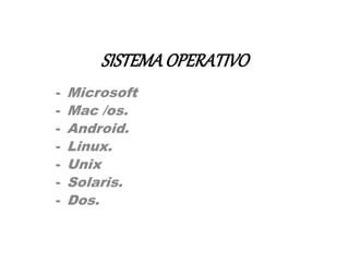 Este documento proporciona una breve descripción de varios sistemas operativos como Microsoft, Mac/OS, Android, Linux, Unix, Solaris y DOS. También describe algunas aplicaciones comunes como antivirus y paquetes de ofimática. Por último, explica diferentes tipos de memorias como SIMM, DIMM, DDR1, DDR2 y DDR3.