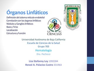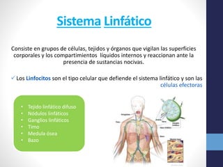 Este documento describe el sistema linfático y sus componentes. Explica que el sistema linfático incluye órganos como los nódulos linfáticos, el bazo y el timo, los cuales albergan y hacen madurar a las células del sistema inmunitario como los linfocitos. También describe las funciones del sistema inmunitario innato y adaptativo, así como los diferentes tipos de células involucradas en la respuesta inmune.