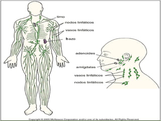 El documento describe el sistema linfático, incluyendo sus componentes principales como los capilares, vasos y ganglios linfáticos. El sistema linfático transporta un fluido llamado linfa a través del cuerpo para mantener el equilibrio de fluidos y filtrar partículas extrañas.