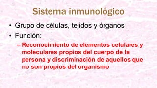 El documento resume los principales componentes y funciones del sistema linfoide y sistema inmune. El sistema linfoide está compuesto de tejido linfoide nodular y difuso, tejido linfoide asociado a mucosas, ganglios linfáticos y bazo. El sistema inmune consta de células, tejidos y órganos cuyas funciones son reconocer lo propio de nuestro cuerpo y defenderlo de lo ajeno. Los órganos linfoides primarios son médula ósea y timo, mientras que los secundarios son