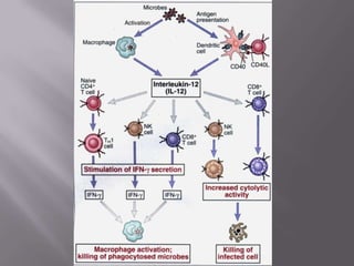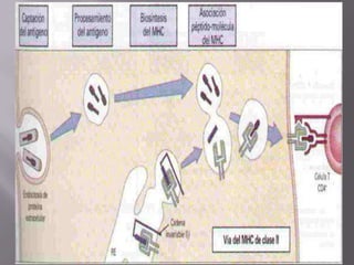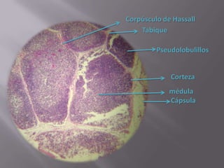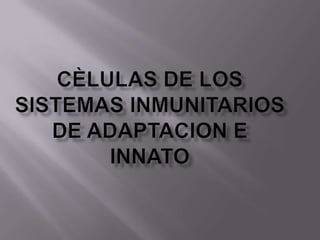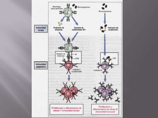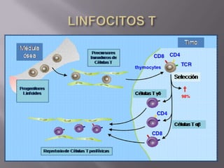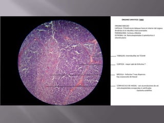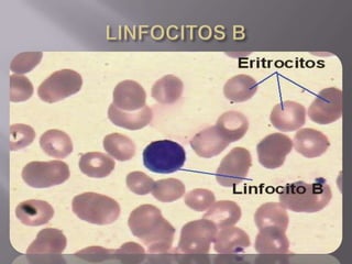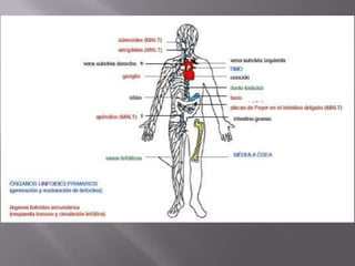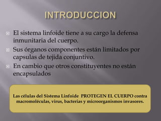 El documento resume el sistema linfoide y sus componentes. El sistema linfoide protege el cuerpo contra invasores mediante sus células y órganos. Incluye la segunda y tercera línea de defensa contra patógenos. Reconoce y combate antígenos de manera específica a través de linfocitos. Sus componentes celulares incluyen neutrófilos, células NK, macrófagos y linfocitos T y B.