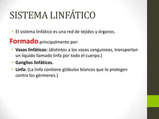 El documento describe el sistema linfático, incluyendo sus funciones principales de eliminar infecciones y mantener el equilibrio de líquidos en el cuerpo. Explica que cuando el sistema linfático no funciona correctamente, puede causar linfedema u hinchazón. Luego enumera y describe varias enfermedades comunes del sistema linfático, como adenopatía, linfedema, lipedema, mixedema y linfangitis.