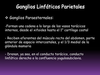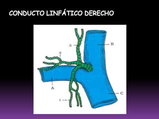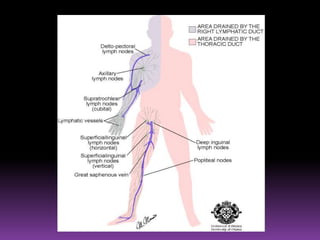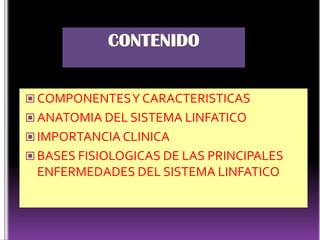 Este documento presenta información sobre el sistema linfático. Describe sus componentes y características, incluyendo la linfa, los vasos linfáticos y los órganos linfáticos. Explica la anatomía del sistema linfático, con detalles sobre la circulación linfática en las extremidades superiores e inferiores. Finalmente, analiza las bases fisiológicas de las principales enfermedades del sistema linfático y su importancia clínica.