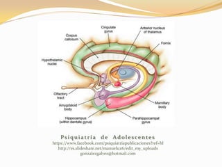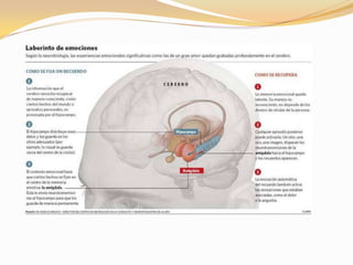 El sistema límbico está formado por varias estructuras cerebrales como el hipocampo, la amígdala y el hipotálamo. Está relacionado con funciones como la memoria, las emociones, el aprendizaje y la conducta. El hipocampo juega un papel importante en la memoria a largo plazo al convertir la memoria a corto plazo, mientras que la amígdala procesa las emociones y respuestas emocionales. El hipotálamo regula funciones fisiológicas y conductuales a trav