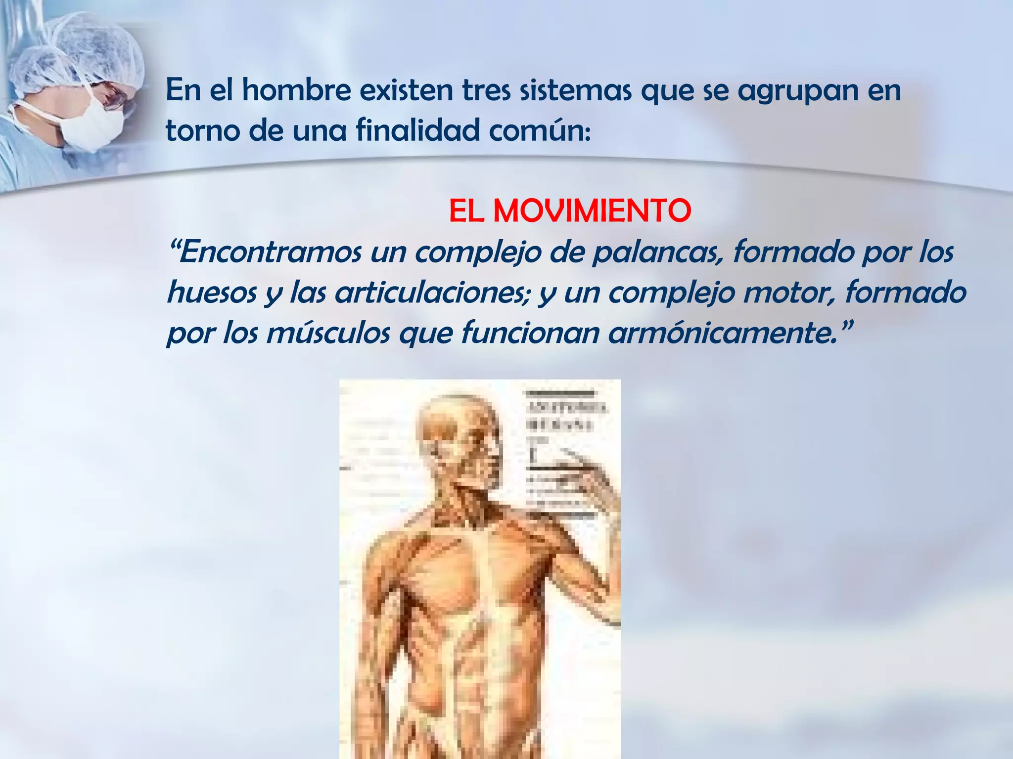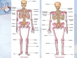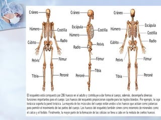 El documento describe el sistema locomotor humano, incluyendo los huesos, músculos y articulaciones que permiten el movimiento. Específicamente, explica que el sistema está compuesto por más de 200 huesos, 100 articulaciones y 650 músculos que trabajan juntos para mantener la postura y permitir el movimiento. También describe las funciones básicas de los huesos como el soporte, la protección y el almacenamiento de minerales.
