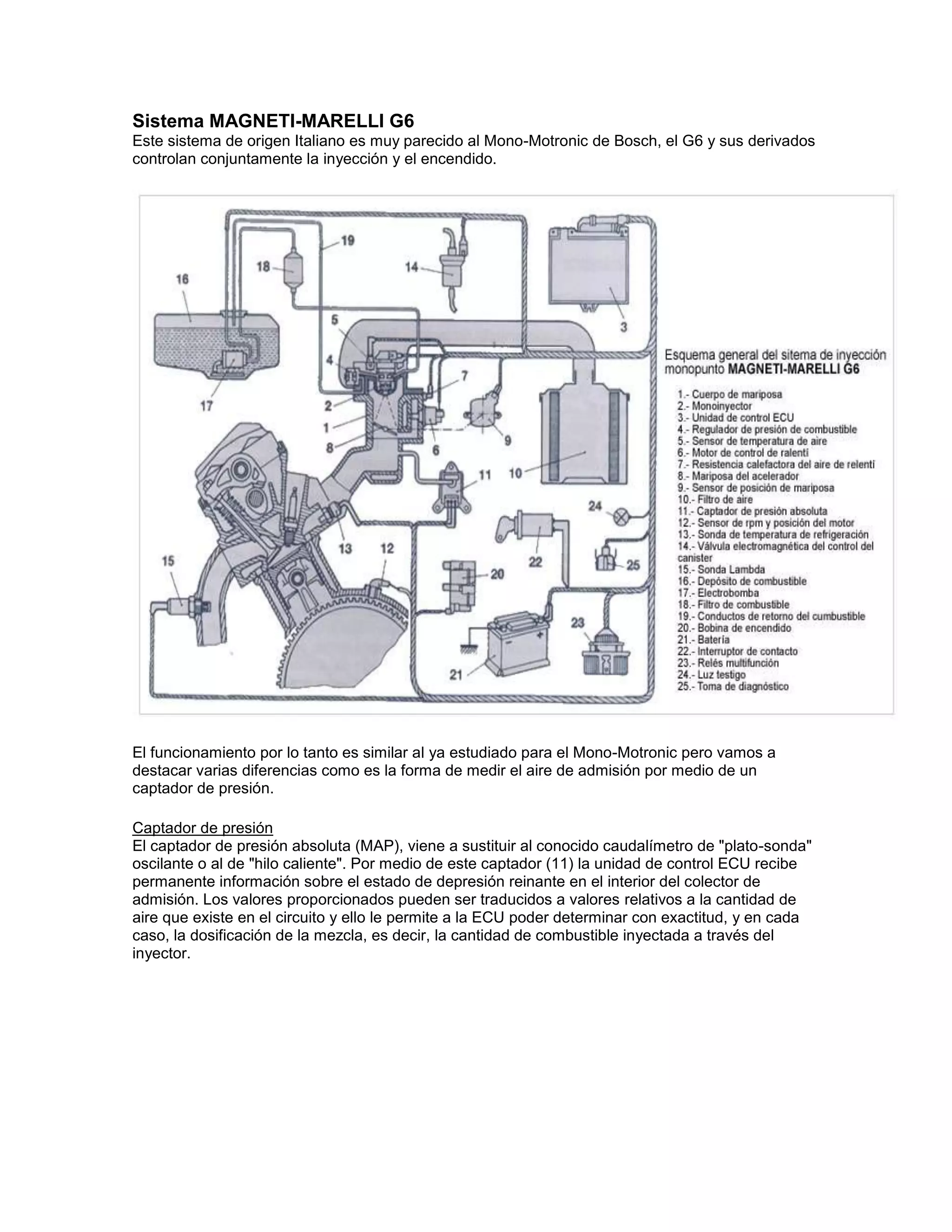 El sistema G6 de Magneti-Marelli controla conjuntamente la inyección y el encendido de manera similar al sistema Mono-Motronic de Bosch. La principal diferencia es que el sistema G6 mide la cantidad de aire de admisión mediante un captador de presión en lugar de un caudalímetro, lo que permite a la unidad de control determinar con precisión la cantidad de combustible a inyectar en función de la presión y temperatura del aire. El captador de presión contiene un diafragma y resistencias sensibles a la deformación que producen una señal de