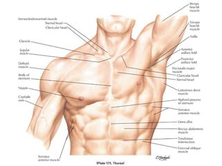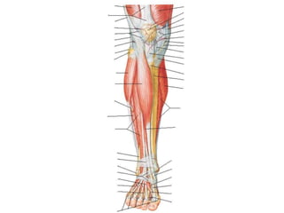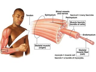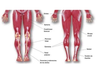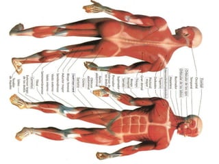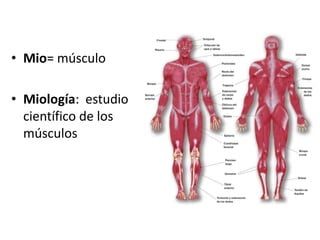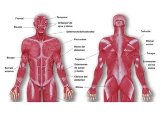 El documento proporciona información sobre el sistema muscular. Explica que los músculos esqueléticos son responsables de mover los huesos y estructuras asociadas a través de la contracción. Describe la anatomía de los músculos, incluida su ubicación, nombre, acción y conexiones con los tendones y huesos. También cubre conceptos clave como agonistas, antagonistas y las propiedades del tejido muscular que permiten la contracción y el movimiento.