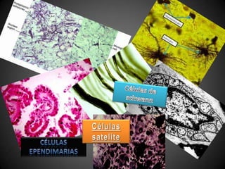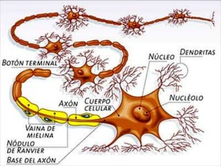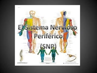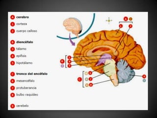 El sistema nervioso se divide en central y periférico. El sistema nervioso central está compuesto por el encéfalo y la médula espinal, y contiene neuronas y células de soporte. El encéfalo incluye el tronco del encéfalo, cerebelo, diencéfalo y cerebro. La médula espinal conecta el encéfalo con el sistema nervioso periférico a través de nervios espinales y craneales.