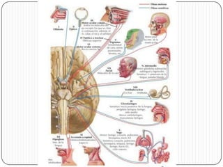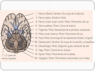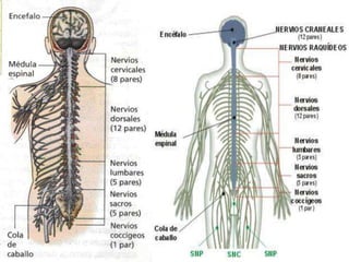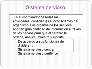 El documento resume las características principales del sistema nervioso. El sistema nervioso está compuesto por el sistema nervioso central (encéfalo y médula espinal) y el sistema nervioso periférico. El sistema nervioso central coordina todas las actividades del organismo a través de las neuronas y células gliales. El sistema nervioso periférico comunica al sistema nervioso central con el resto del cuerpo a través de los nervios craneales y espinales.