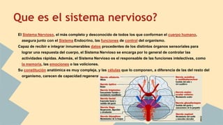 El documento describe el sistema nervioso. Explica que el sistema nervioso está formado por el sistema nervioso central y el sistema nervioso periférico. El sistema nervioso central incluye el encéfalo, que contiene el cerebro, cerebelo y tronco encefálico, y la médula espinal. El sistema nervioso tiene funciones sensitivas, integradoras y motoras como recibir estímulos, analizar información y responder mediante contracciones musculares o secreciones glandulares.