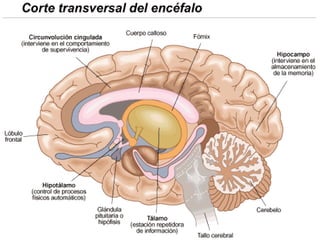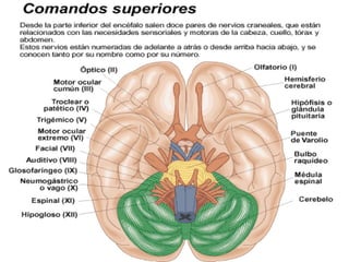 El documento describe las principales partes del sistema nervioso humano, incluyendo el cerebro, cerebelo, médula espinal, nervios craneales y nervios raquídeos. Explica que el cerebro controla las funciones fisiológicas y los sentidos, mientras que el cerebelo coordina los movimientos musculares y la médula espinal conduce los impulsos nerviosos entre el cerebro y el cuerpo.