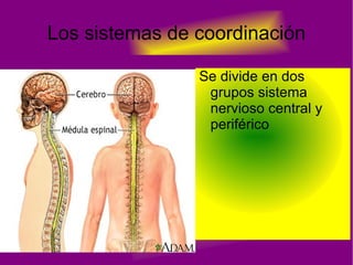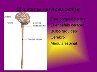 El documento describe el sistema nervioso y hormonal del cuerpo humano. Explica que el sistema nervioso se divide en central y periférico, y que el central incluye el cerebro, cerebelo, tronco encefálico y médula espinal. También describe los tipos de neuronas, posibles alteraciones en el sistema nervioso como trastornos orgánicos o psíquicos, y cómo las drogas pueden causar toxicidad, dependencia y tolerancia. Finalmente, resume cómo las hormonas como la insulina y el glucagón controlan los nive