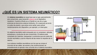 Este documento describe los componentes y funcionamiento de un sistema neumático. Un sistema neumático utiliza aire comprimido para transmitir potencia mecánica a través de componentes como compresores, depósitos, válvulas, conductos y actuadores. Los sistemas neumáticos se usan comúnmente en herramientas como martillos neumáticos y taladros dentales.