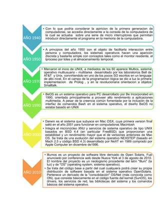 Este documento presenta una línea de tiempo de los sistemas operativos desde 1940 hasta 2010. En la década de 1940, las primeras computadoras se programaban directamente a través de interruptores. En la década de 1950 aparecieron los primeros sistemas operativos simples como el procesamiento por lotes. En la década de 1970 surgieron sistemas multiusuarios como UNIX. En la década de 1990, BeOS fue un sistema operativo para PC orientado a aplicaciones multimedia. En el 2000, Darwin subyace a Mac OS X e integra componentes de UNIX. En