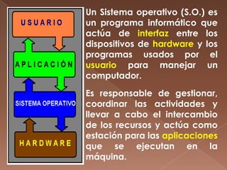 Un sistema operativo es un programa que gestiona los recursos del hardware y permite la interacción entre los dispositivos, el software y el usuario. Se encarga de ejecutar instrucciones, controlar el acceso, administrar la CPU, memoria, entrada/salida y programas en ejecución. La interfaz gráfica de Windows proporciona un entorno visual sencillo mediante ventanas flotantes, botones de control y casillas de verificación.